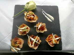 Janice’s colleagues opted for a menu of classic canapes, including smoked salmon and pâté en croute, and a traditional Hog Roast served buffet-style, so guests could enjoy the food as and when they pleased and get to spend as much time with their guest of honour as possible before they went their separate ways. We arrived at the party venue several hours before it was due to start and as always, got stuck into preparing everything from scratch. As we worked throughout the day, Janice’s colleagues gradually transformed the function room into a hip 60s nightspot and when the band arrived, we felt like we were cooking in the Cavern Club!